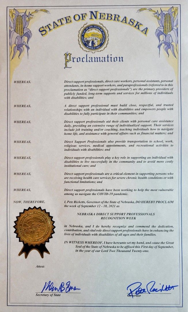 Therefore I, Pete Ricketts, Governor of the state of Nebraska, do hereby proclaim September 12th-18th, 2021 Direct Support Professional Recognition Week. I encourage all Nebraskans to recognize and appreciate the dedication and contributions of these providers."
